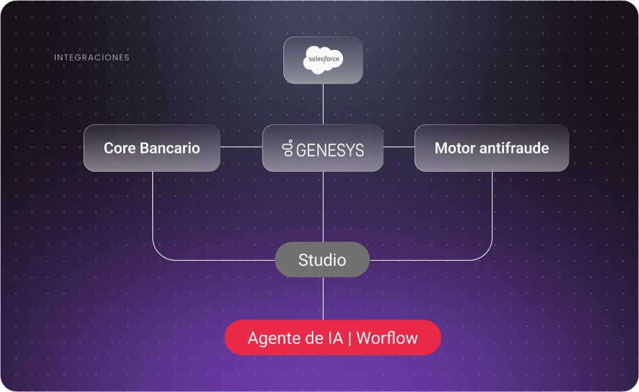 Los agentes se conectan al core bancario, CRMs (Salesforce, Zendesk, etc.), centros de contacto (Genesys, Five9, etc.), motores de fraude, sistemas de conocimiento y canales digitales. Studio orquesta flujos de trabajo a través de todo tu stack tecnológico.