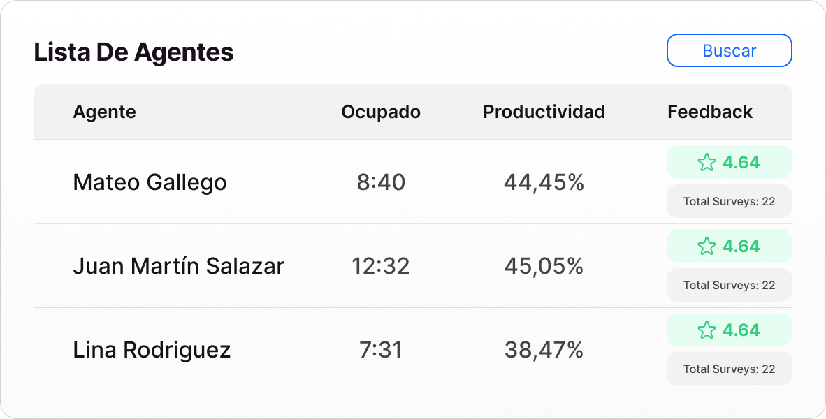Los supervisores obtienen una vista unificada que combina productividad y satisfacción del cliente, lo que permite intervenciones proactivas y mejoras continuas basadas en datos concretos.