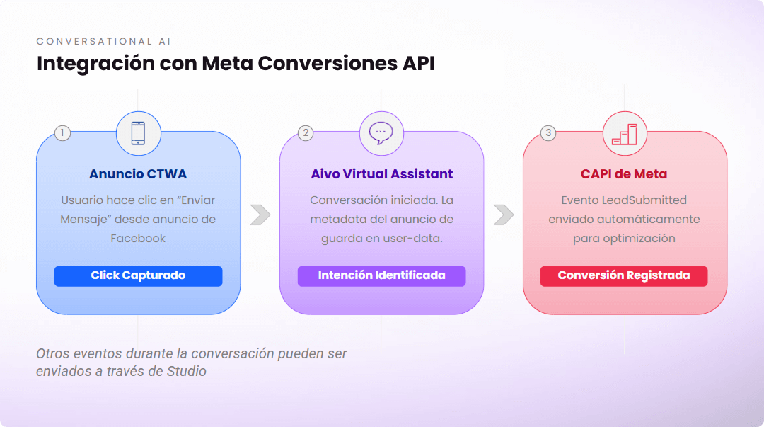 El AI Agent de Aivo ahora envía automáticamente eventos de conversión desde los anuncios Facebook Click-to-WhatsApp (CTWA) hacia la API de Conversiones de Meta (CAPI). Cuando un usuario hace clic en un anuncio y comienza una conversación con el agente, la interacción se registra de inmediato como un evento LeadSubmitted en la plataforma de Meta, habilitando atribución directa y optimización automática de campañas.