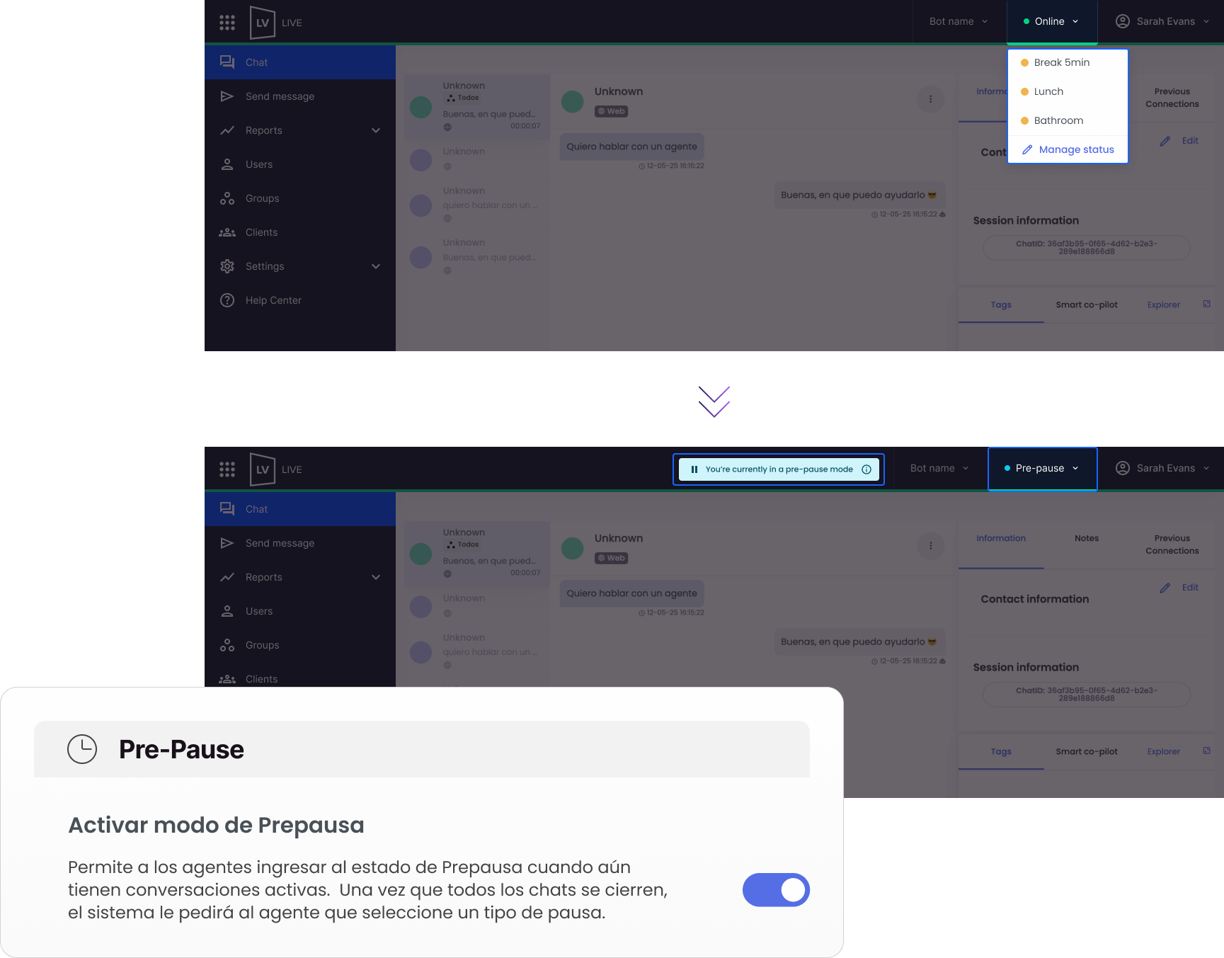 - Control de Pausa Programada: los agentes pueden finalizar conversaciones activas antes de tomar descansos, mejorando la gestión de carga de trabajo.