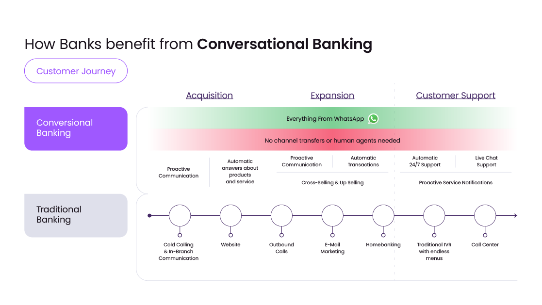 WhatsApp Banking se puede utilizar durante todo el recorrido del cliente, desde la adquisición hasta la retención.