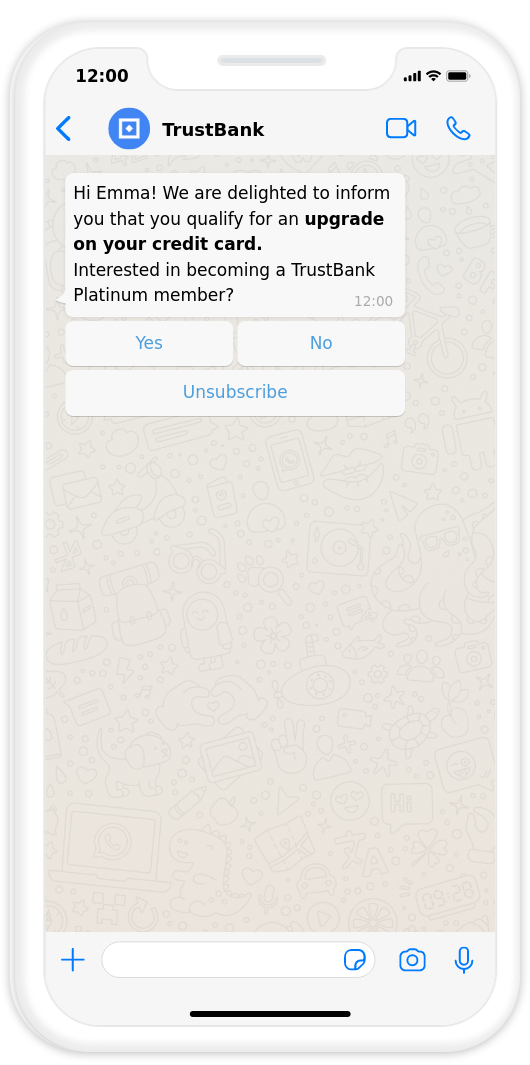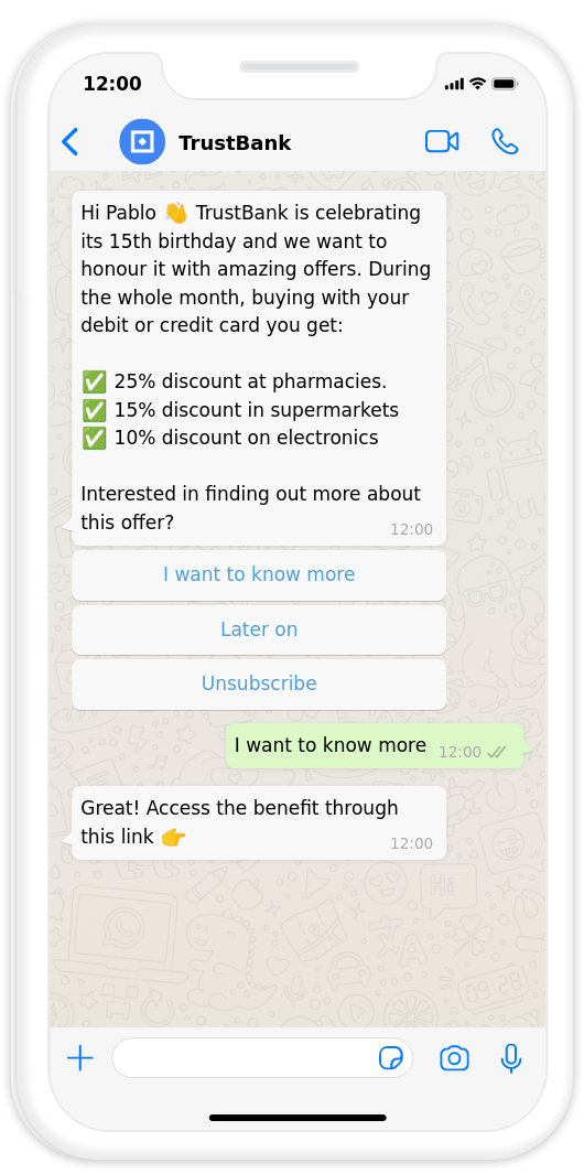 Con la banca conversacional, todo el recorrido del cliente se puede implementar en WhatsApp sin necesidad de transferencias de canales ni agentes humanos. Las empresas pueden implementar notificaciones proactivas, automatizar transacciones, realizar ventas cruzadas y de productos y servicios, y brindar soporte las 24 horas del día, los 7 días de la semana. ¡Todo por el mismo canal!