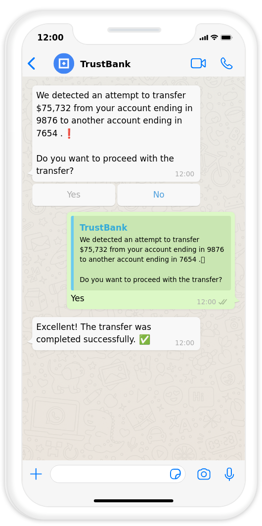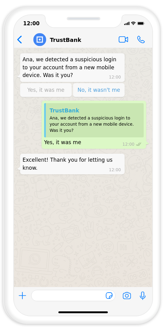 Por ejemplo, los bancos pueden enviar notificaciones proactivas cada vez que identifican movimientos inusuales y los clientes pueden bloquear sus tarjetas en cualquier momento a través del bot conversacional en WhatsApp. De esta manera, proteger a sus clientes está a solo una interacción de distancia.