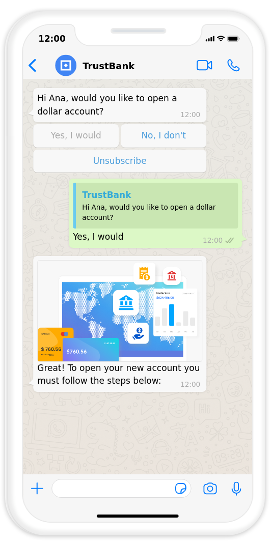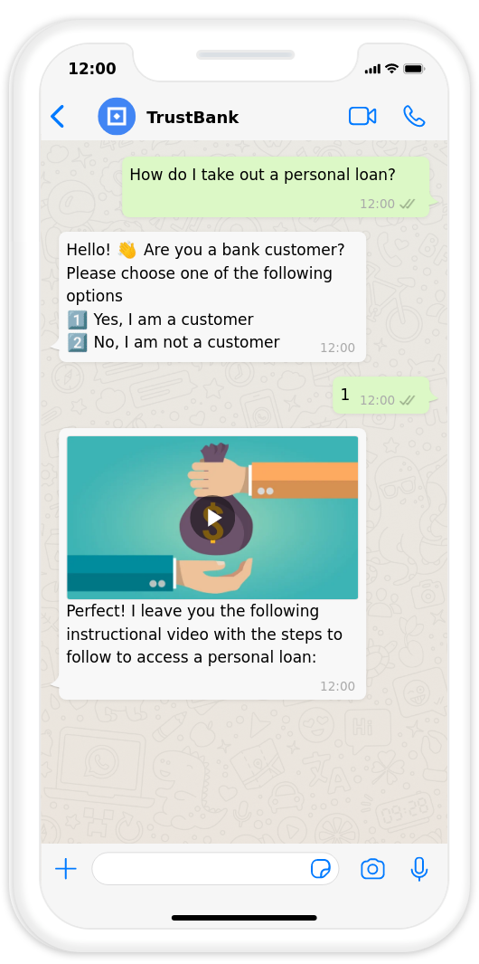 ¿Usted y su empresa se mantienen al tanto de las últimas tendencias? El servicio de atención al cliente de WhatsApp hace que sea muy fácil participar en una comunicación de vanguardia con los clientes. Con la tecnología de chatbot de WhatsApp, puede automatizar el servicio al cliente y asegurarse de que los clientes obtengan la ayuda que necesitan de manera oportuna. Hoy en día WhatsApp Business es una parte esencial de la estrategia digital de cualquier banco.