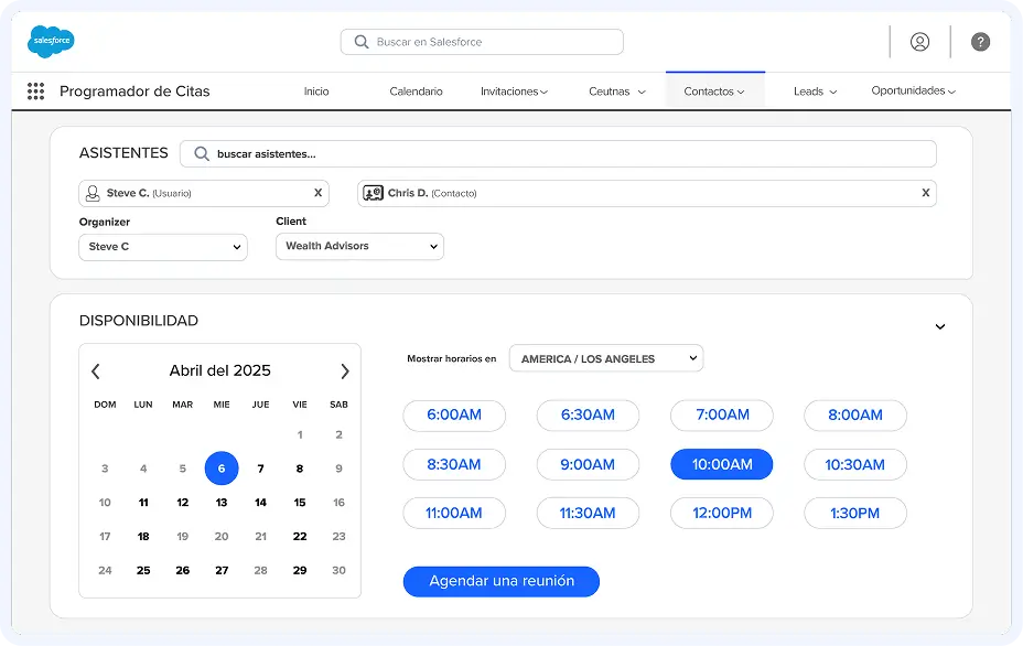 Los usuarios pueden programar reuniones directamente desde Leads, Cuentas de Persona, Contratos y otros registros de Salesforce. Todos los datos de citas se vinculan automáticamente al registro del CRM, asegurando visibilidad completa y reportes precisos.